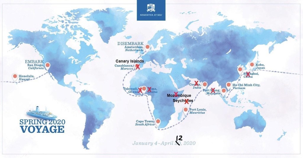 We have the option to get off in Las Palmas or the Netherlands, as our last day of school is April 3rd, the day before arrival in Las Palmas. I am still unsure what I want to do. My decision will vary on factors such as how the virus has continued to spread in Europe, quaratine situations in Europe and at home, and travel with friends. I know the outbreak is spreading in Washington, with UW and Eastern closing campuses. I pray that everyone at home is staying safe, and I am unsure when I’ll be coming home. Hoping for the best!